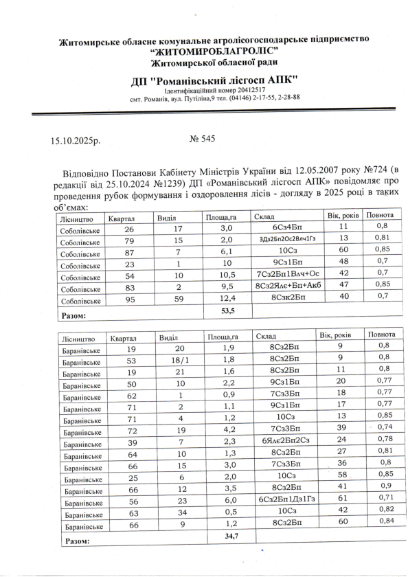 В 2022 р. в ДП "Романівський лісгосп АПК" буде заготовлено 12400 м³ необробленої деревини в порядку рубок головного користування. Вся продукція буде реалізована на аукціоні.